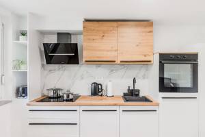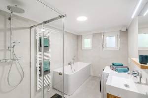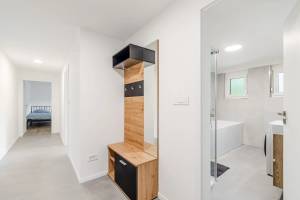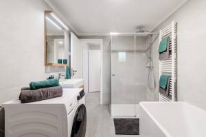 Kuhinja z jedilnico je popolnoma opremljena, vključno s pomivalnim strojem in pečico. Prostorna kopalnica ponuja tuš, kopalno kad in pralno-sušilni stroj.