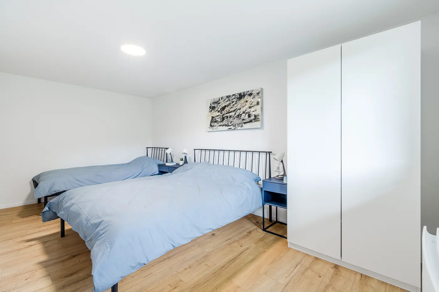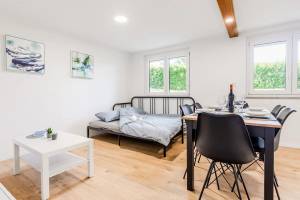 Apartma ima 1 spalnico, opremljeno z zakonsko in enojno posteljo, ter dnevno sobo z dodatno posteljo za 2 gosta.